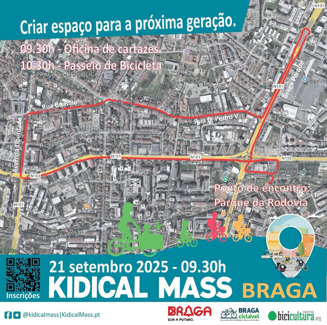 A Kidical Mass, um passeio de crianças, jovens e famílias, realizar-se-á em Braga no dia 21 de setembro com ponto de encontro às 09h30 – para oficinas de cartazes – no Complexo Desportivo da Rodovia e saída para o percurso às 10h30.