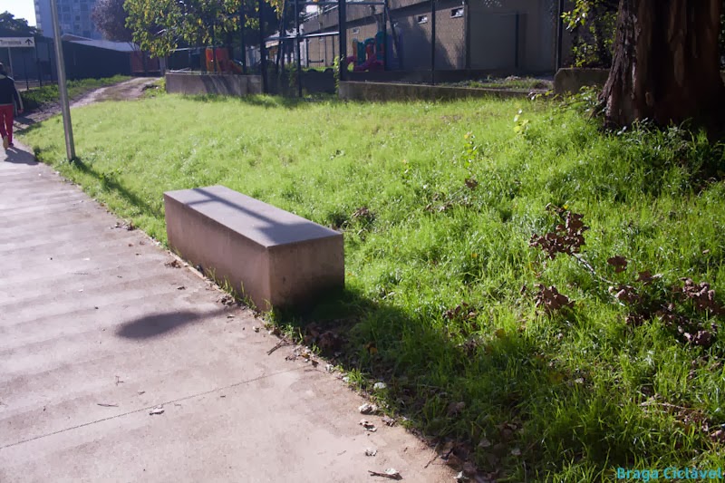 Um outro problema encontrado ao longo de toda a via é a colocação dos bancos junto da via, acabando por tirar algum espaço à mesma quando as pessoas se encontram sentadas nos mesmos. Esta questão resolver-se-ia com a colocação dos bancos afastada 0,50m da via, por exemplo.