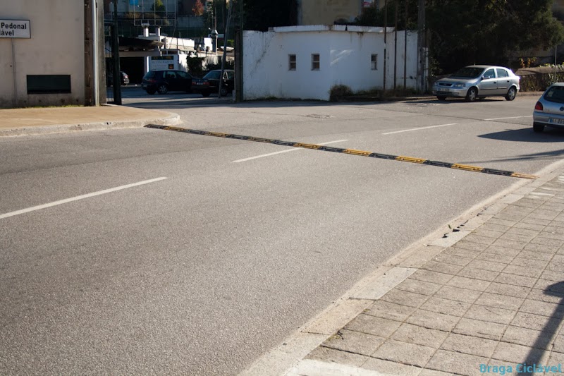 De um dos lados a passadeira é resguardada por uma lomba, do outro lado não temos qualquer tipo de medida de acalmia de tráfego.